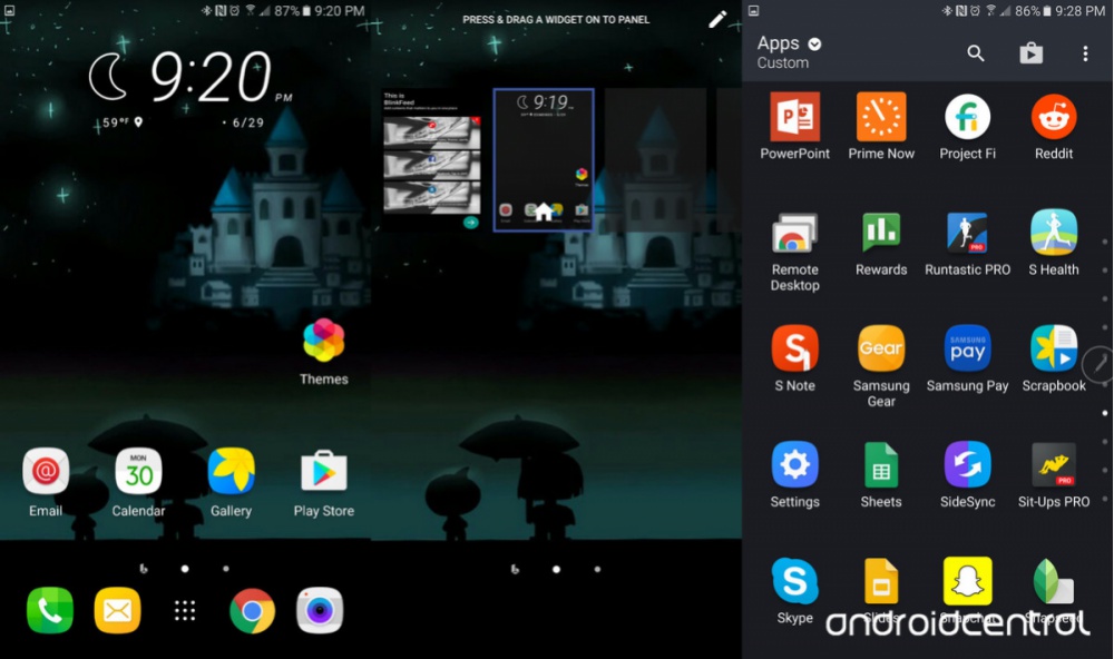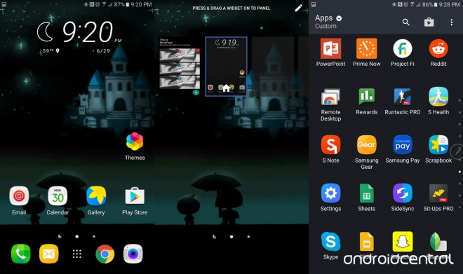 O visual da tela inicial parece se acomodar muito bem com o pacote de ícones nativo oferecido pela Samsung, deixando o foblet top de linha da marca com uma aparência refinada no design de software. A versão aplicada no aparelho é a 8.01.772516, obtida por meio de adaptação oficial do que se pode ver no HTC 10.