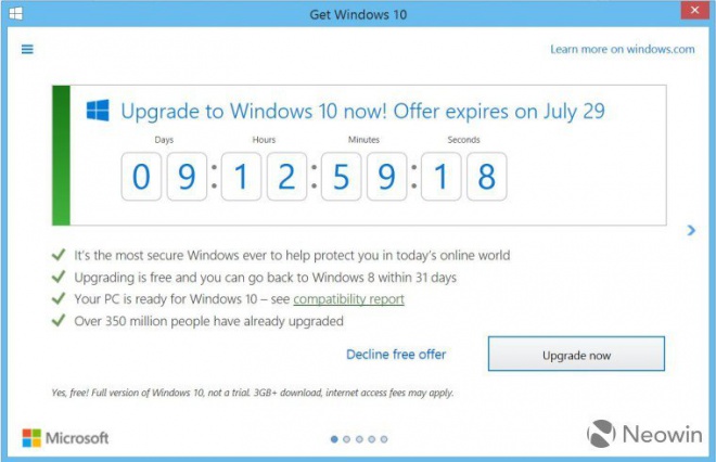 Faltam poucos dias para o fim da atualização gratuita do Windows 7, 8 e 8.1 para o 10. Mais especificamente, já faltam cerca de nove dias. Por isso, a Microsoft está tentando chamar a atenção dos usuários que manifestaram interesse e ainda não realizaram o update. E como? Incluindo um contador regressivo no aplicativo Get Windows 10, para que o usuário saiba exatamente quando tempo ele tem para começar a fazer a atualização.