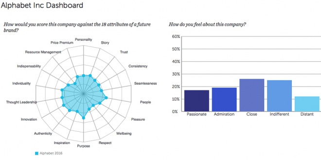 Isso acabou sendo representado na pesquisa ao passo que a Alphabet alcançou apenas a 21º colocação. Um quarto dos entrevistados informaram se sentir próximos à Alphabet e quase o mesmo número afirmou ser indiferente. Menos de 20% afirmaram que admiravam a empresa, sendo seus dois maiores atributos o senso de propósito e qualidade das pessoas. Mais de 60% afirmaram que analisam a empresa avançando nos próximos três anos, enquanto um terço compraria produtos da Alphabet e 40% trabalhariam na companhia.