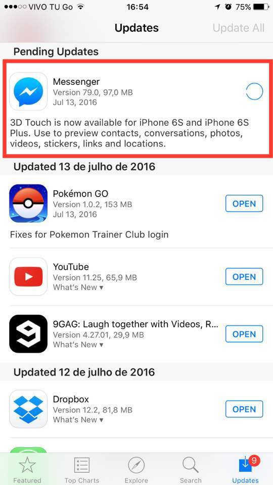 O mensageiro agora poderá desfrutar ainda mais da tecnologia 3D Touch presente no iPhone 6s e 6s Plus — além da já existente opção de pre-visualizar seu código QR e contatos favoritos no ícone, agora é possível utilizar os gestos Peek e Pop em uma infinidade de situações, tais como, pré-visualizando contatos, mensagens, links, vídeos, imagens, localizações e até mesmo stickers: