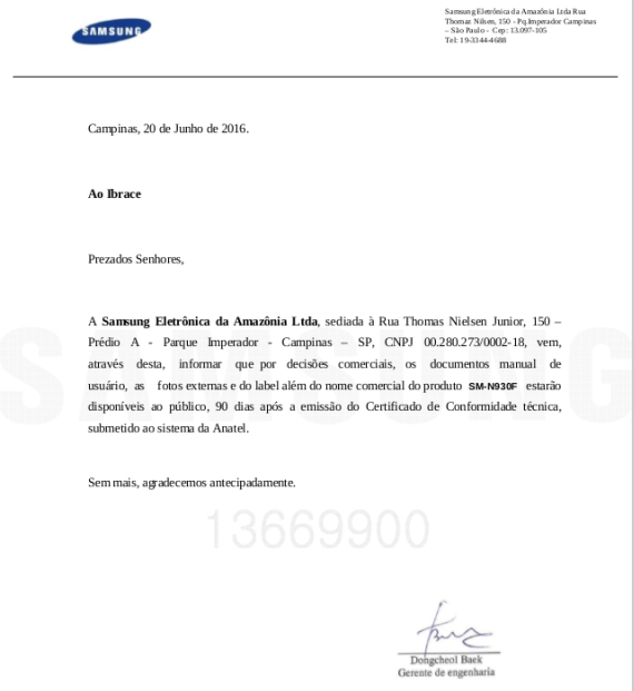 Após 24 horas depois de termos visto a notícia de que o Galaxy Note 7 havia sido homologado nos Estados Unidos, agora é a vez do tão aguardado phablet sul-coreano passar por outro processo de certificação, desta vez no Brasil. O documento abaixo foi enviado pela Samsung Brasil para a Agência Nacional de Telecomunicações (ANATEL) em 20 de junho deste ano. Nele vemos que Samsung informa que os documentos do manual de usuário do modelo SM-N930F estarão disponíveis ao público 90 dias após o aparelho passar por certificação de conformidade técnica.