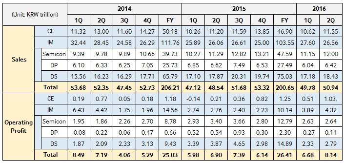 A divisão de componentes (DS), por outro lado, passou por um período não tão animador. Ainda que as vendas tenham sido consideravelmente maiores do que nos anos anteriores, a redução no valor de venda de displays e semicondutores fez com que a receita proveniente deste setor diminuísse em cerca de 28%, o que acabou afetando o lucro operacional da Samsung como um todo. Com a demanda cada vez maior por telas e outros componentes, principalmente por parte de fabricantes chinesas, é esperado que as receitas voltem a crescer nos próximos meses.