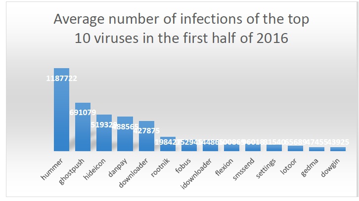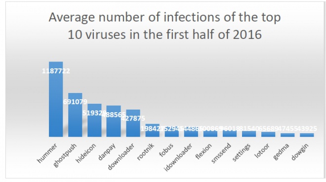 A Cheetah Mobile afirmou, ainda, que os números de dispositivos infectados pelo Hummer faz dele o maior trojan do mundo no primeiro semestre de 2016, conforme podemos ver no gráfico abaixo.