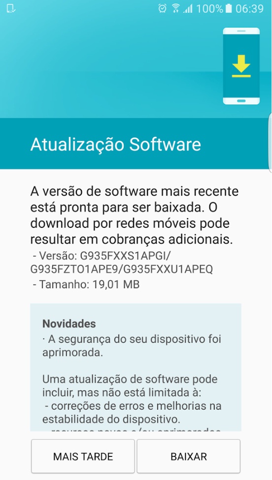 A versão do firmware é a XXS1APGI, para o Galaxy S7 Edge, como pode ser visto acima. O bootloader e o modem permanecem os mesmos, o que mostra que as únicas alterações realizadas pela Samsung estão apenas relacionadas à segurança do sistema. Isto também é informado na lista de novidades que apenas relata: “A segurança do seu dispositivo foi aprimorada”.