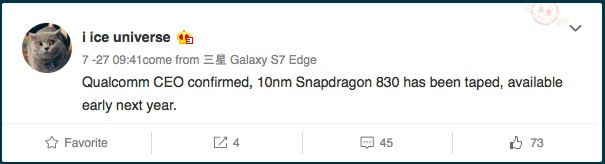 Segundo revelado em uma publicação na rede social chinesa Weibo, o CEO da Qualcomm teria confirmado que o Snapdragon 830 será fabricado também em processo de 10nm, buscando assim rivalizar com os demais em termos de equilíbrio entre eficiência energética e potência. Além disso, é dito que o chipset chegará ao mercado já no início de 2017, o que significa que poderemos ter lançamentos durante a CES em janeiro portando o novo SoC de alto desempenho. Com os já conhecidos rumores de que a Samsung iria adiantar o anúncio do Galaxy S8 para tal evento, é impossível não ligarmos uma coisa à outra.