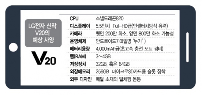Na parte das câmeras, é comentado que o aparelho terá um módulo principal de 20 megapixels e um frontal de 8 megapixels. Isto é no mínimo curioso, já que a própria LG confirmou que o V20 terá duas câmeras em sua parte posterior, e o V10 possui duas câmera frontais, logo em ambos os casos teríamos a possibilidade de registrar imagens com um módulo duplo. Obviamente que o responsável pelo rumor pode ter focado apenas na câmera com resolução máxima nas partes traseira e frontal, porém ainda é cedo para afirmarmos que ele de fato conta com informações privilegiadas.