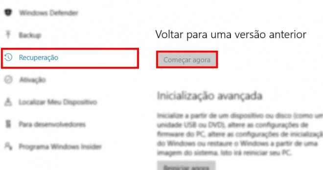 Em “Recuperação”, localize o item “Voltar para uma versão anterior” e clique em “Começar agora”.