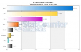 A Noruega tem estatísticas semelhantes, mas com uma característica interessante. A versão mais recente do Windows é executada em 36% dos PCs, à frente do Windows 7 e do Mac OS X que vêm em segundo e terceiro lugares com percentagens de 28% e 20%, respectivamente. No entanto, o país parece ter dificuldade para abrir mão do Windows 98. Em vez de se encontrar o Windows XP entre as estatísticas, o Windows 98 tem com uma quota de quase 3,5% do mercado. Considerando que já se passaram uns bons vinte anos desde o lançamento desse sistema, não temos muita ideia sobre o que os noruegueses estão fazendo.