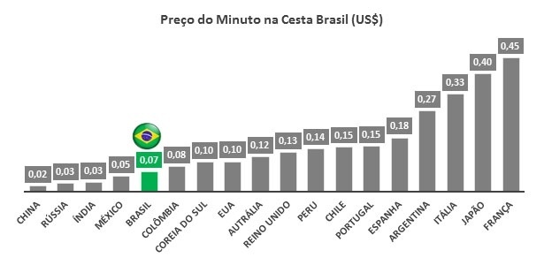 Com um custo médio de US$ 0,066 (cerca de R$ 0,22), o minuto do celular no Brasil permanece um dos mais baratos do mundo pelo terceiro ano consecutivo, segundo a consultoria Teleco. Ainda assim, o país tem a maior carga tributária entre os 18 países pesquisados.